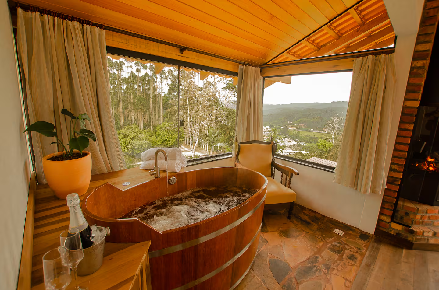 Um chalé rústico com varanda de frente para a mata, ideal para quem quer descansar ouvindo o som dos pássaros. A decoração é cheia de charme, com toques artesanais e materiais naturais.