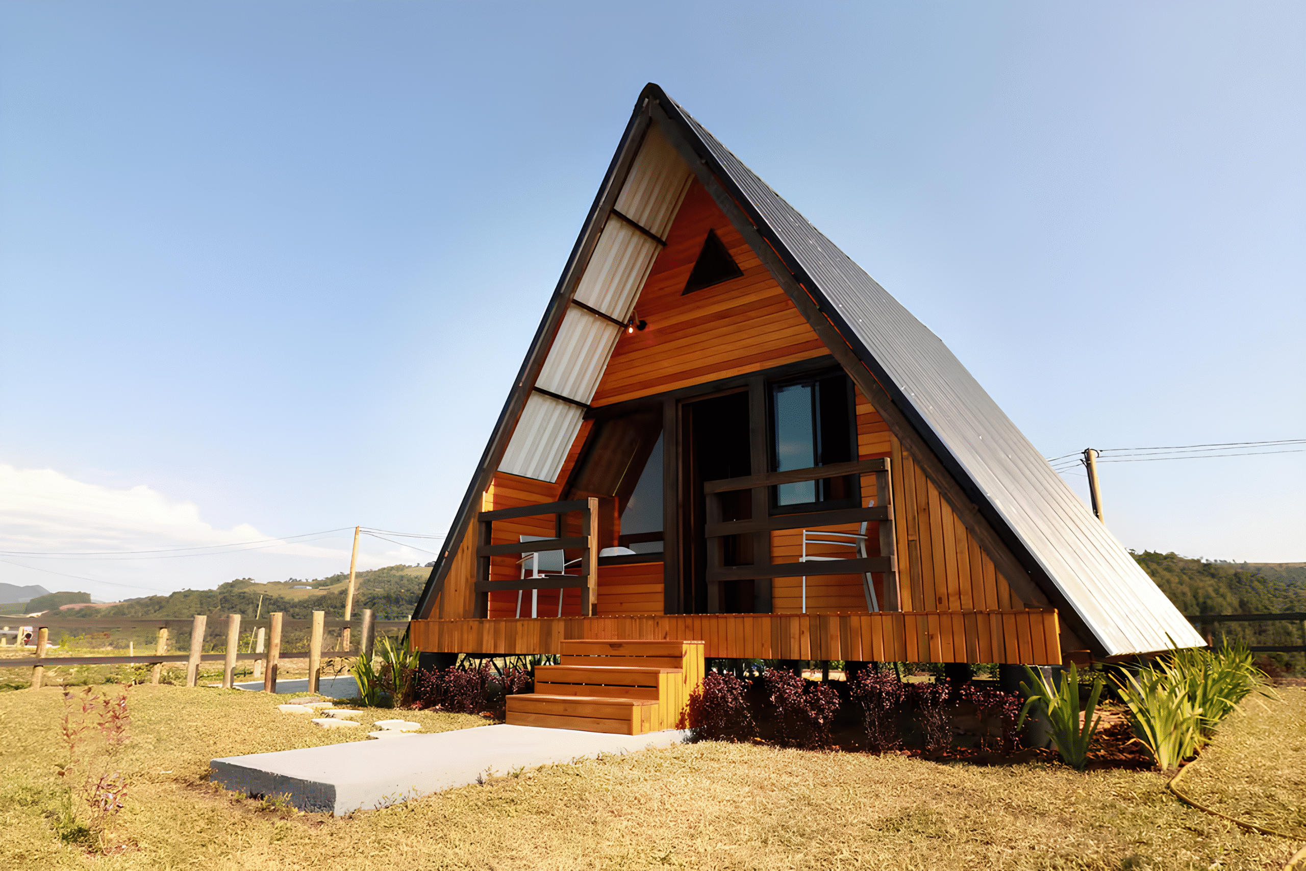 Um chalé rústico com varanda de frente para a mata, ideal para quem quer descansar ouvindo o som dos pássaros.